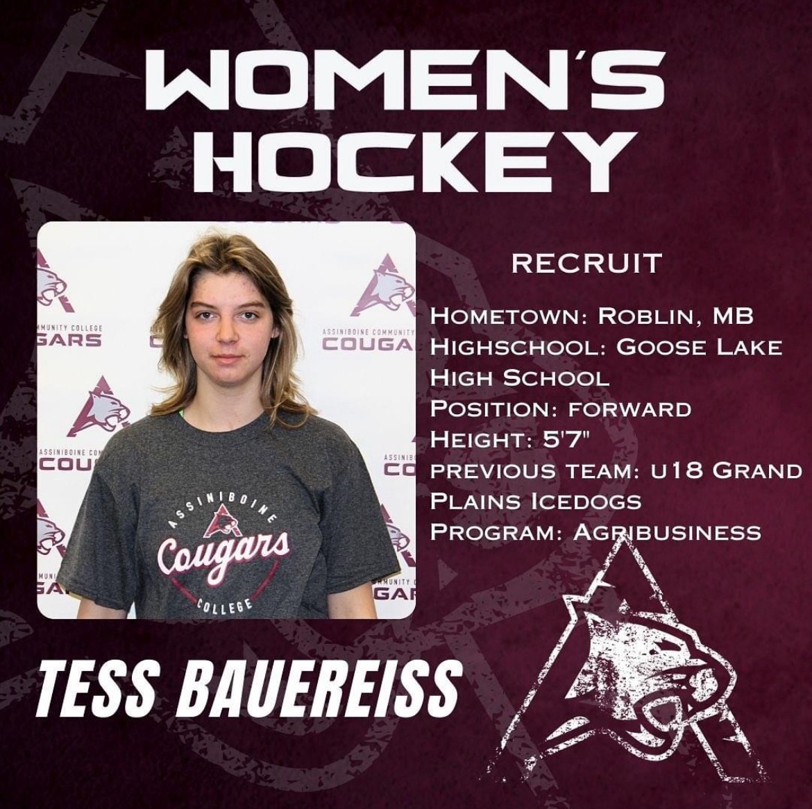 We’d like to welcome Grand Plains Ice Dogs prospect Tess Bauereiss from Roblin, Manitoba to the ACC Cougars women’s hockey program for 2024-2025.